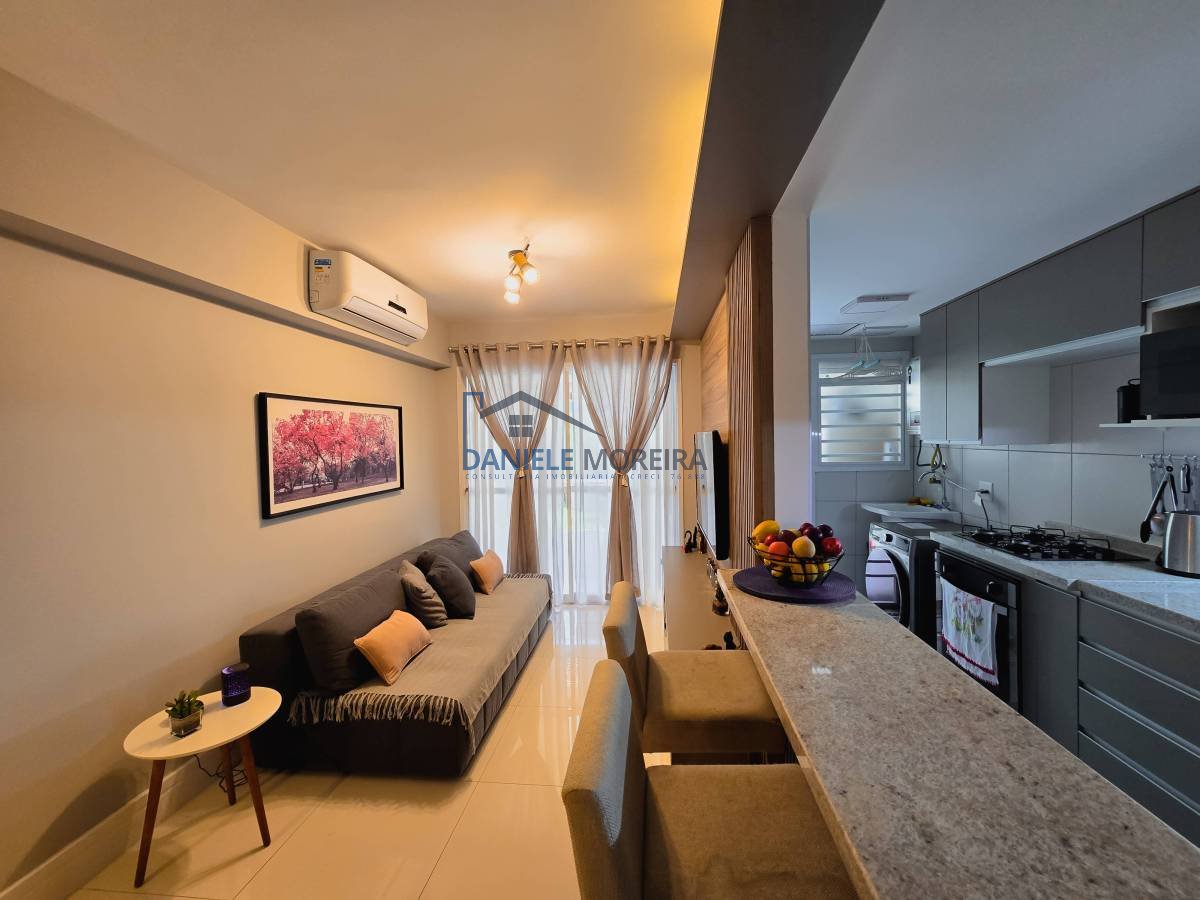 Sala ampla em dois ambientes, cozinha em conceito aberto, área de serviço, lavabo revertido, banheiro e dois quartos, sendo uma suíte
